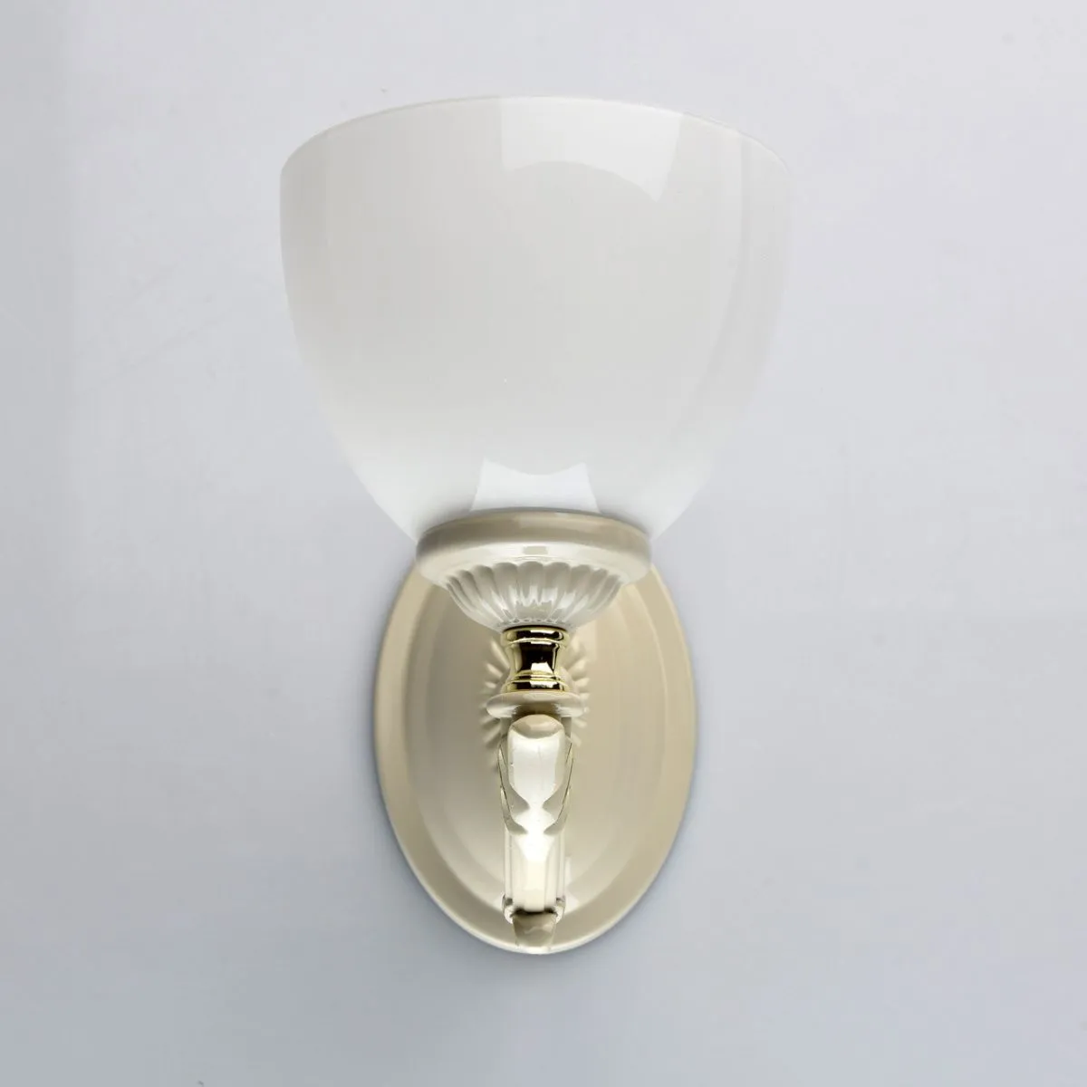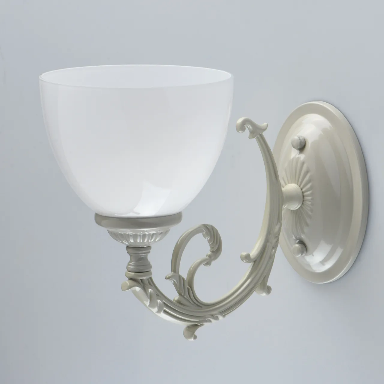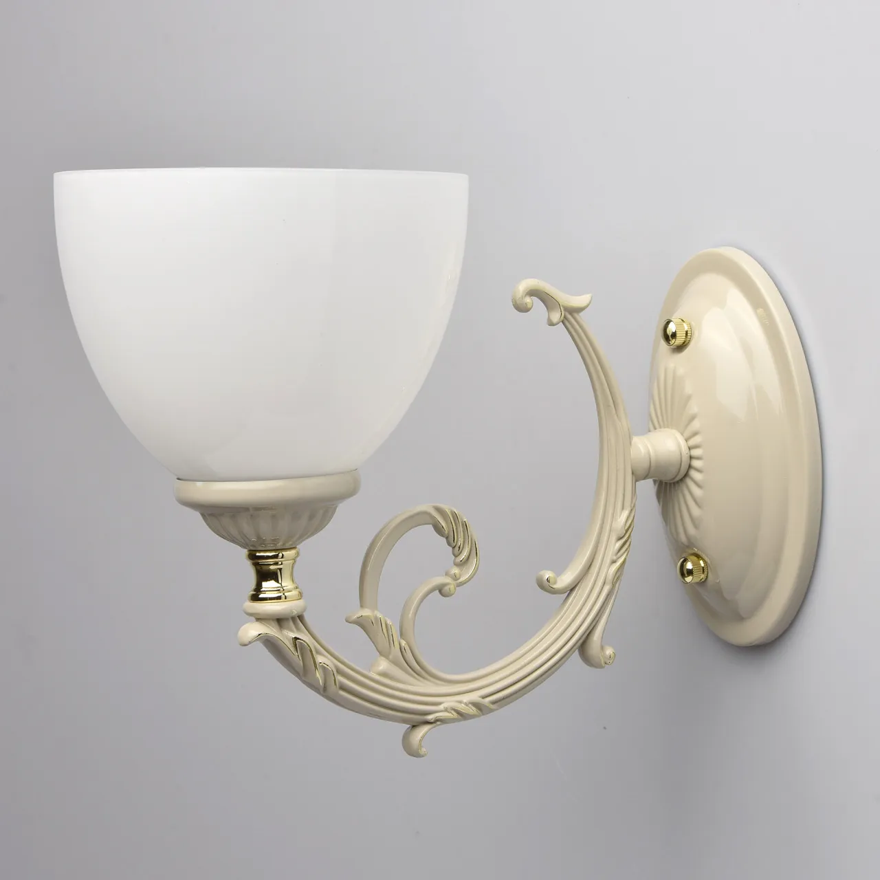 Металлическое основание цвета слоновой кости. Плафоны: белый плафон из стекла.