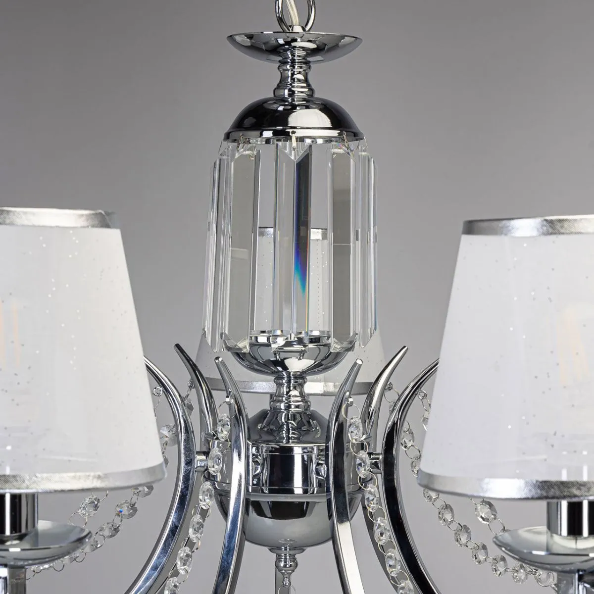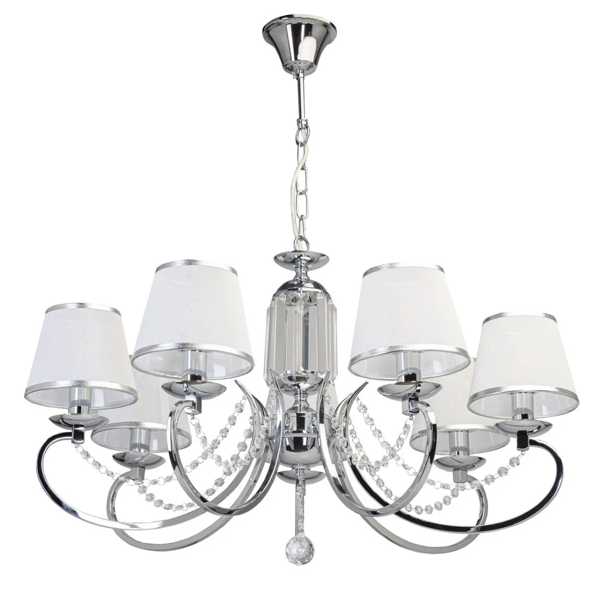 Основание/ металл/ хром Абажур/ текстиль, акрил/ белый, прозрачный Декор/ хрусталь/ прозрачный