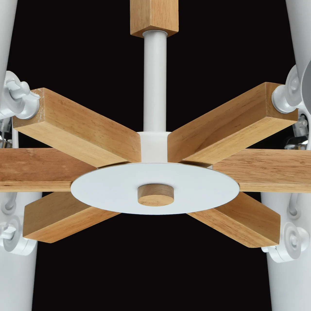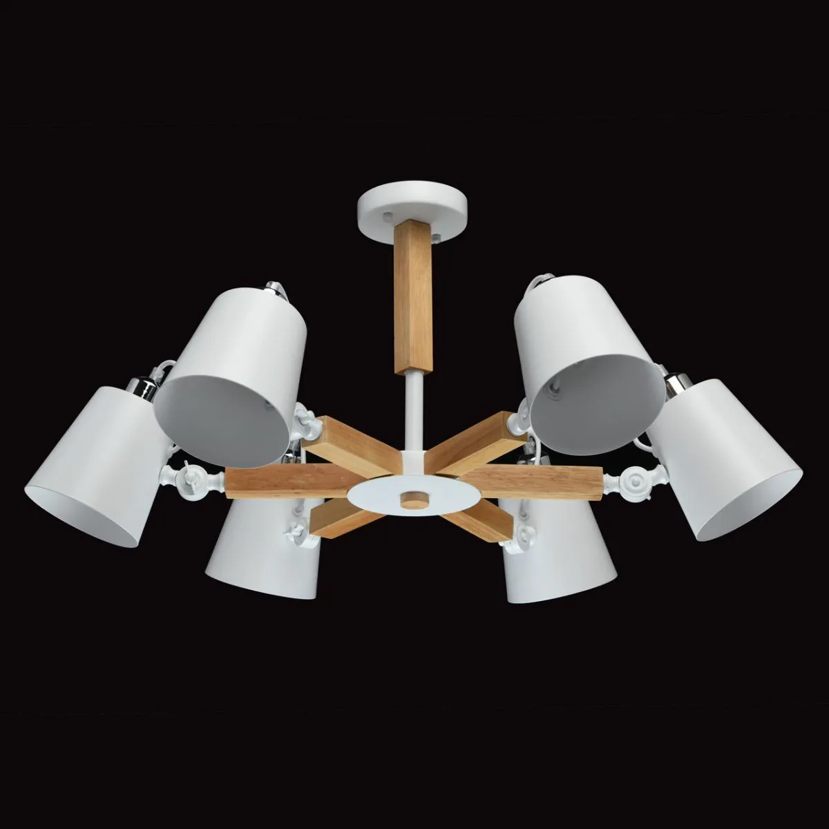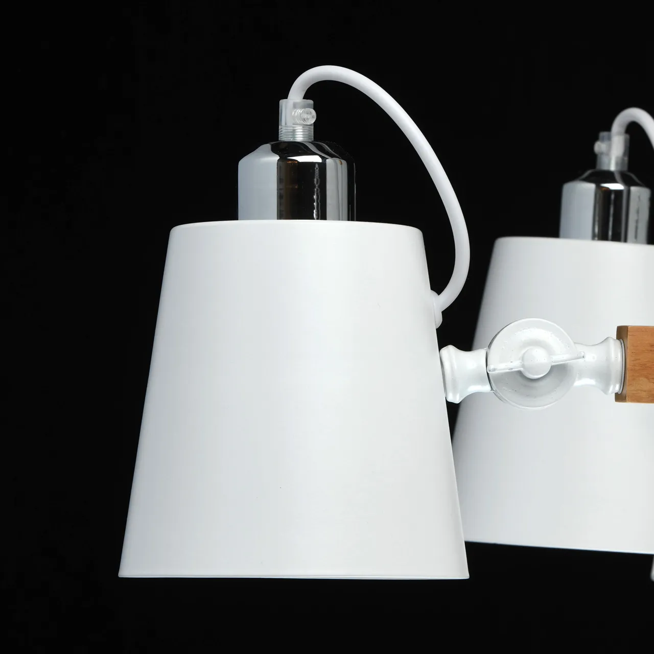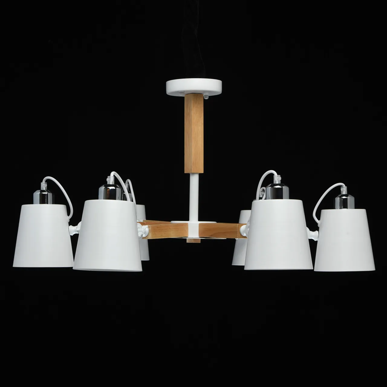 Металлическое основание белого цвета, дерево. Металлические плафоны белого цвета.