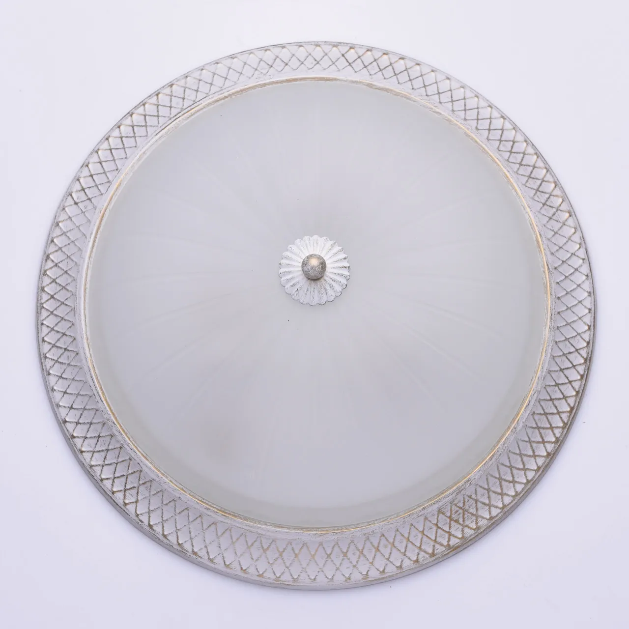 Металлическое основание белого цвета с золотистой патиной. Плафоны: матовый стеклянный плафон.